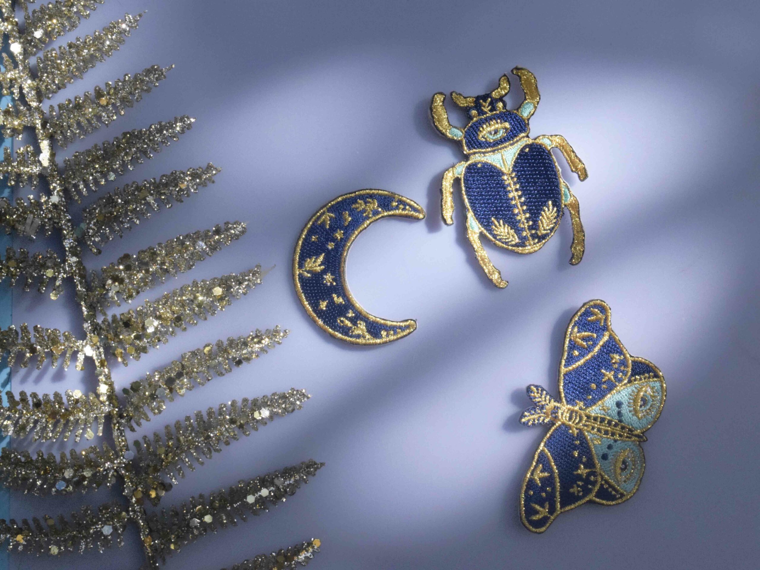 Trio butterfly, beetle and moon iron-on patches, these 3 mystical patches with these precious golden threads will be the perfect detail to fine-tune your look day or night, the thing is that they can be ironed in seconds Respectful of nature Materials – cotton