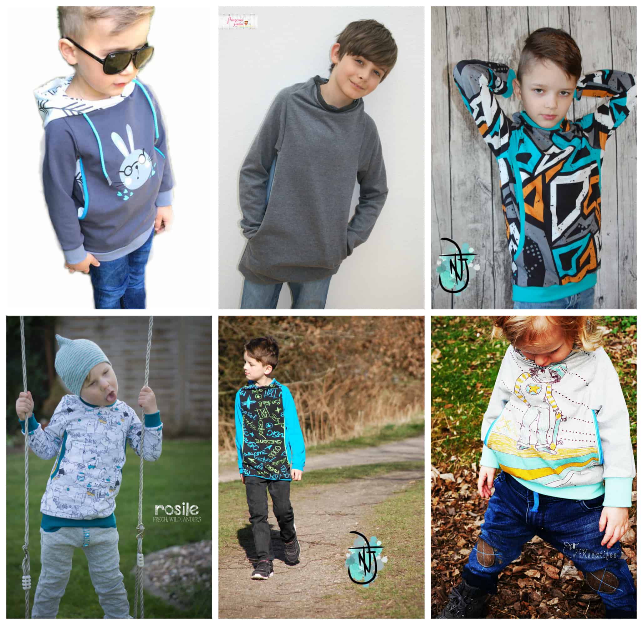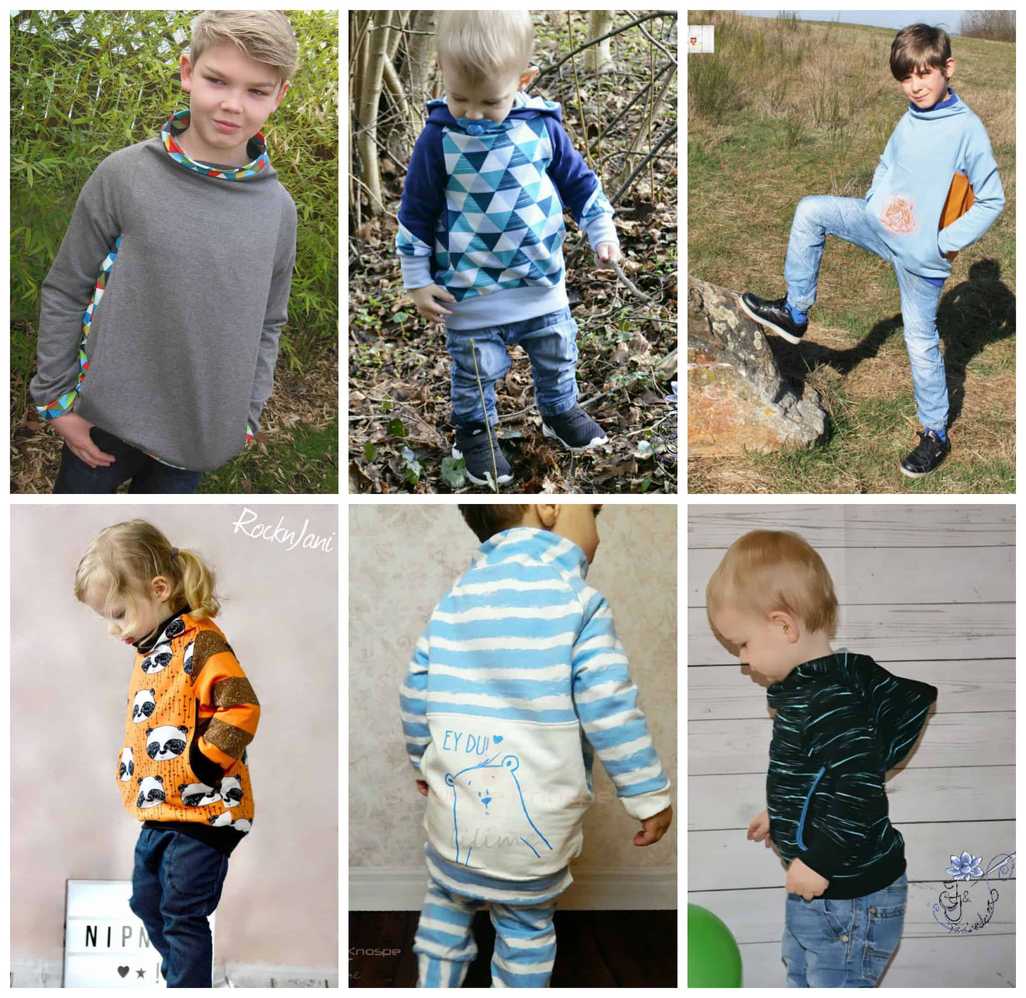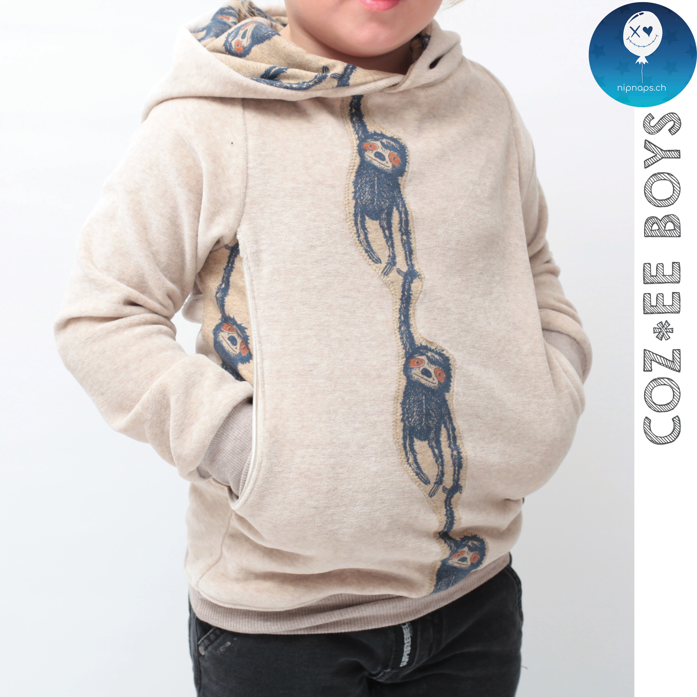 In den Grössen 80 bis 164 ist der Coz*ee einmal für Boys und einmal für Girls gradiert. Die Boys Version ist gerade geschnitten. Die Girls Variante ist ballonförmig und hat eine hübsche Teilung mit Kellerfalte am Rückteil. Beide Varianten können entweder mit Kapuze oder mit dem Oversize Raglankragen genäht werden.