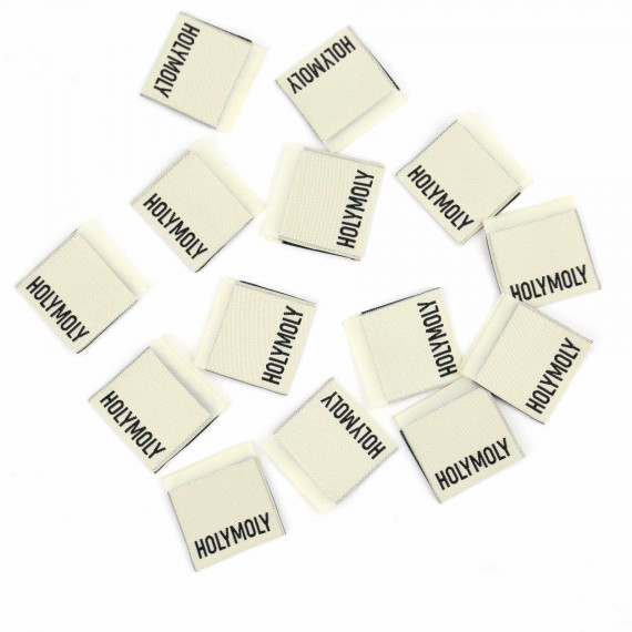 1 tolles gewebtes Label mit Mittelfaltung zum in die Naht Einnähen! Hier ein elfenbeinfarbenes Label mit „Holy Moly!“ Schriftzug in Schwarz.