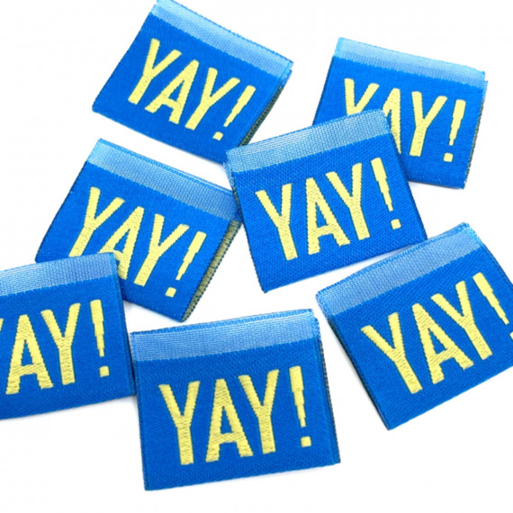 1 tolles gewebtes Label mit Mittelfaltung zum in die Naht Einnähen! Hier ein dunkelblaues Label mit „YAY!“ Schriftzug in Royalblau und Pastellgelb.